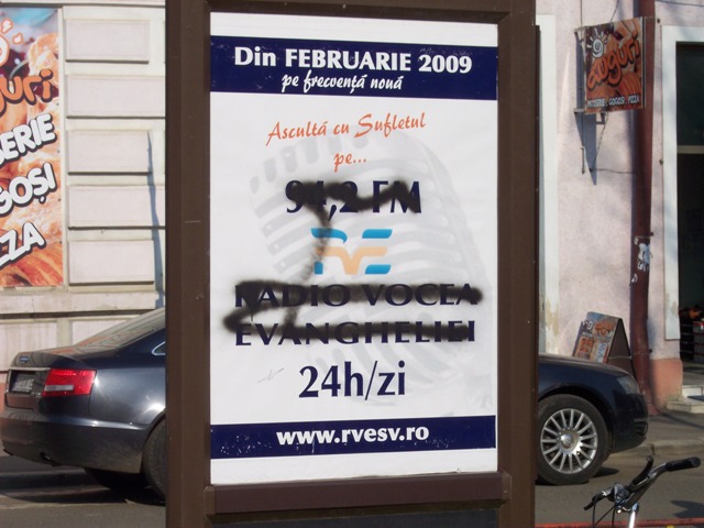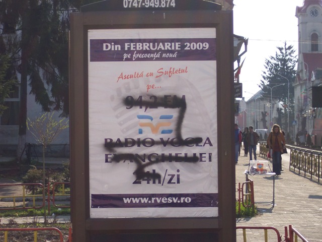 La Radauti panoul publicitar cu Vocea Evangheliei a fost vandalizat desi locatia sa a fost schimbata dupa ce s-au exercitat unele presiuni. Desi traim intr-o tara libera practica dovedeste ca nu te poti exprima liber.