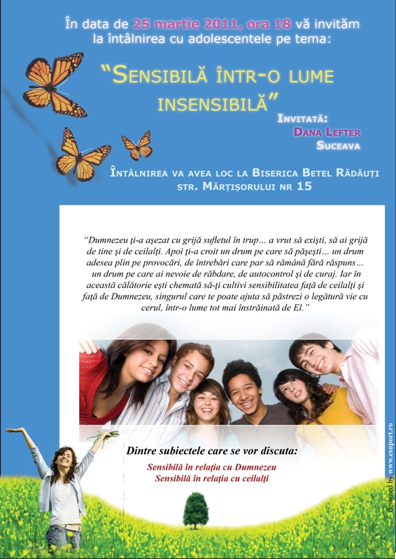 Acest articol a fost publicat în DIVERSE și etichetat Conferinta Betel Radauti, Dana Lefter, Sensibila intr-o lume insensibila. Pune un semn de carte cu legătura permanentă.