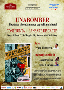 Luni, 16 mai 2011 începând cu ora 17.00, Alexandria Librarii şi Shopping City Suceava vă invită la un eveniment deosebit: lansarea cărţii “Unabomber-Profetul ucigaş” de Ovidiu Hurduzeu. Manifestarea, găzduită de City Galerry (Shopping City Suceava), îi va avea ca invitaţi speciali (pe lângă autorul cărţii) pe domnii Nicolae R. Dărămuş şi Alexandru Ciolan.