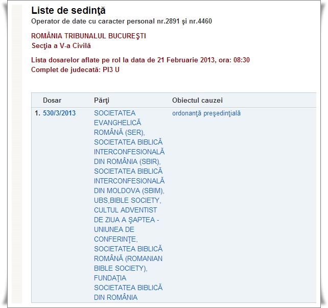 Astăzi 21 februarie 2013 a avut loc al doilea termen în procesul iniţiat de Societatea Evanghelică Română împotriva a şase organizaţii care au ca obiect de activitate tipărirea de biblii. Prin acest demers Societatea Evanghelică Română intenţionează să îşi adjudece dreptul de autor pentru versiunile Cornilescu.