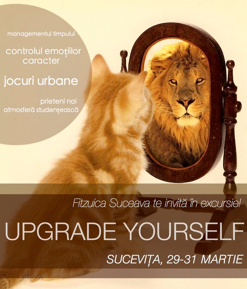 „UPGRADE YOURSELF” este excursia organizata de Fitzuica Suceava, intre 29-31 martie. Pretul este de 150 ron si include masa, cazare si transport. Din programul excursiei: seminarii de managementul timpului, controlul emotiilor, caracter, jocuri urbane. Intr-o atmosfera studenteasca vei avea ocazia sa iti faci prieteni noi, sa interactionezi si sa te dezvolti personal. Te poti inscrie cu un email la fitzuicasuceava@gmail.com .