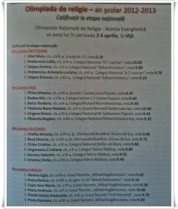 Calificaţii la Olimpiada Naţională de Religie din partea de nord-est a ţării.