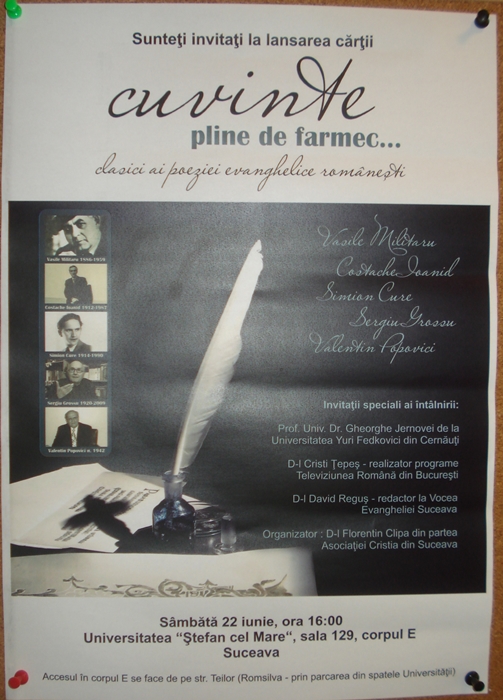 Pe 22 iunie 2013 la ora 16:00 în sala 129, corpul E a Universității ”Ștefan cel Mare” va avea loc lansarea unui volum care se dorește a fi primul dintr-o serie care va alcătui o antologie a poeziei evanghelice românești. În acest prim volum se regăsesc poezii de Vasile Militaru, Costache Ioanid, Simion Cure, Sergiu Grossu, Valentin Popovici.