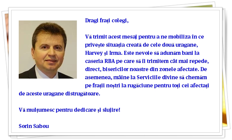 Sorin Sabou, preşedintele Romanian Baptist Association of SUA and Canada, cheamă pastorii bisericilor baptiste din America să se implice financiar pentru a ajuta bisericile afectate de recentele uragane.