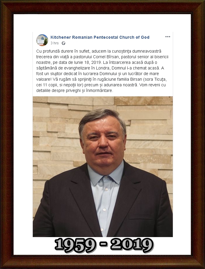 Vestea plecării in veșnicii a pastorului Cornel Bârsan la o vârsta in plină putere de slujire, ne amintește inca odata cât de trecători suntem. Din Atlanta transmitem Sincere Condoleanțe Familiei îndoliate, Bisericii si tuturor celor ce simțiți durerea despărțirii.