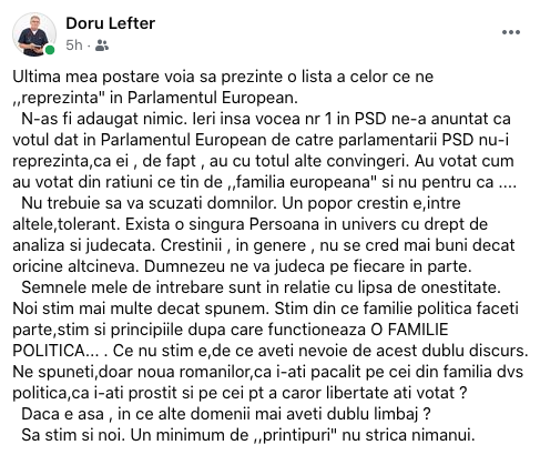 Doru Lefter este atent la ceea ce se întâmplă în zona politicului astfel că evidențiază dubla măsură a unor europarlamentari debusolați.