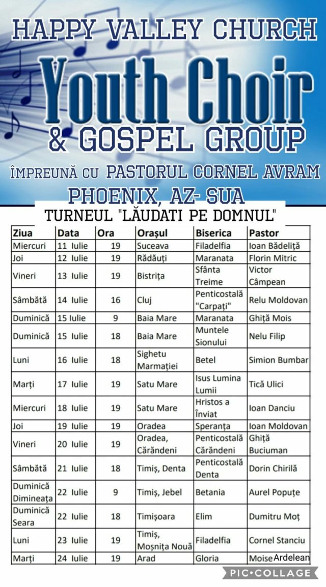 Turneul va începe miercuri 11 iulie 2018 din Suceava. La biserica Filadelfia se va da startul acestui tur care se va finaliza pe 24 iulie la Arad. Corul din Happy Valley este însoțit de pastorul Cornel Avram.